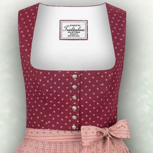 Dirndl bordeaux begeistert durch den hochgeschlossenen Schnitt und ist mit liebevollen Details versehen. Klassisch zurückhaltend und trotzdem edel, so verzaubert das Dirndl mit pflegeleichter Baumwolle in floralem Allover.