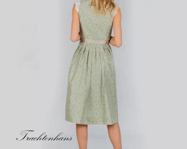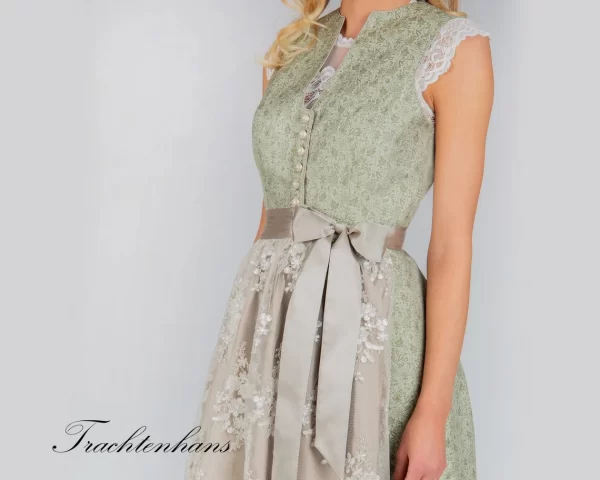 Das hochgeschlossene Dirndl besticht durch das trendige Jacquard Muster und ist sehr schlicht gehalten. Das traditionelle Mieder mit Stehkragen wird durch edle, farblich passende Trachtenknöpfe verziert. Der schwingende Rock fällt elegant und wird durch die aufwendig bestickte Spitzenschürze perfekt abgerundet.