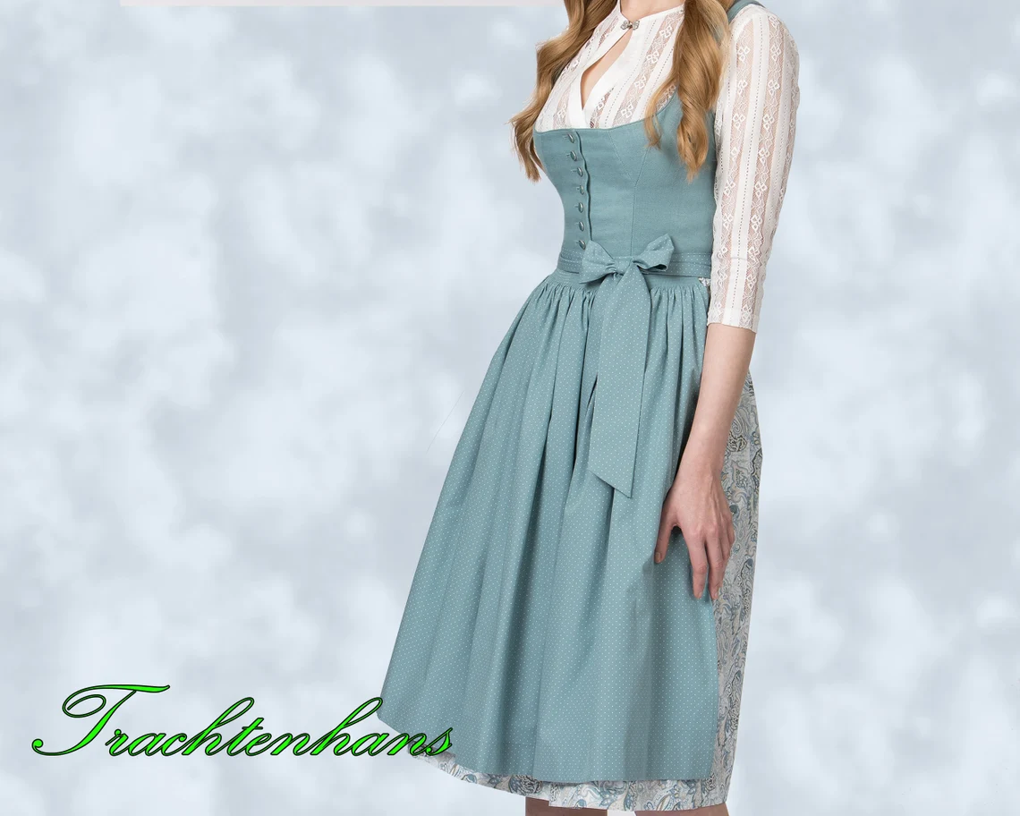 Dieses Modell sorgt für einen gelungenen Auftritt. Das Mieder des sommerlichen Dirndls ist aus einem hochwertigen Leinenstoff gefertigt. Der Münchner Schnitt passt perfekt zu diesem zeitlosen Dirndl. Die ausgefallenen Perlmutt Knöpfe unterstreichen den besonderen Trachten Look. Der pflegeleichte, bedruckte Rock aus Baumwolle und die farblich passende Schürze runden das traditionelle Modell gekonnt ab.