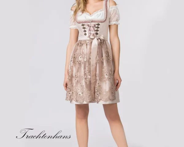 Das stilvolle Dirndl begeistert durch das stilvolle Jacquard Muster und ist mit liebevollen Details versehen. Für die feminine Note sorgen die eingearbeiteten Rüschen, die aufgenähten Zierborten sowie die mit Straßsteinen verzierten Miederhaken. Die Schnürung aus zwei verschieden farbigen Satinbändern unterstreicht die feminine Note. Durch die filigrane, farblich abgestimmte Spitzenschürze entsteht der besondere Look.