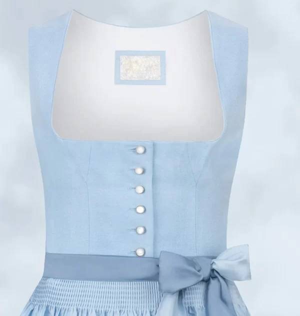 Trachtenhans präsentiert stolz das Dirndl in einem strahlenden Hellblau. Dieses exklusive Modell garantiert einen unvergesslichen Auftritt. Das Mieder dieses sommerlichen Dirndls besteht aus hochwertigem Leinenstoff und wurde im traditionellen Münchner Schnitt gefertigt, was perfekt zu seinem zeitlosen Charme passt. Die edlen Perlmutt-Knöpfe verleihen dem Trachten-Look eine besondere Note. Der pflegeleichte, bedruckte Baumwollrock und die farblich abgestimmte Schürze komplettieren dieses meisterhaft gestaltete traditionelle Ensemble.