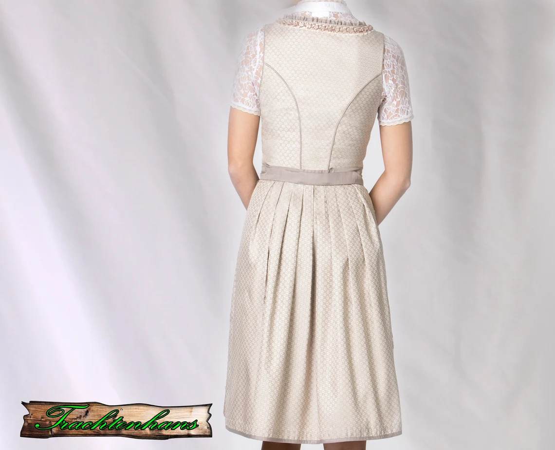 Das stilvolle Dirndl begeistert durch das florale Allover Muster und ist mit liebevollen Details versehen. Für die feminine Note sorgen die eingearbeiteten Rüschen am Rundausschnitt, die aufgenähten Zierborten sowie die mit Strasssteinen verzierten Miederhaken. Die Schnürung aus einem farbig passenden Satinband unterstreicht das Design. Der in Falten gelegte Rock mit einer Schubtasche fällt elegant und wird durch die farblich abgestimmte Spitzenschürze perfekt abgerundet.