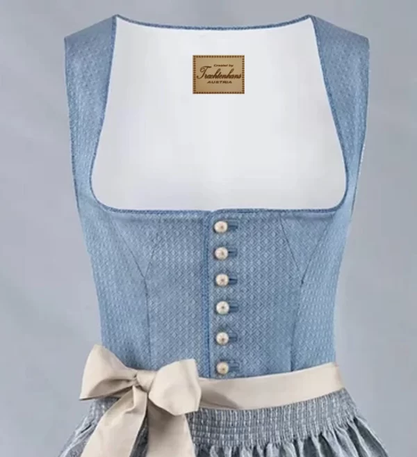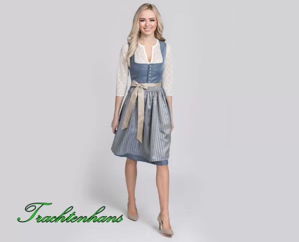 Dirndl für Damen in rauchblau besticht durch den Münchner Schnitt und ist mit liebevollen Details versehen. Das Mieder ist aus einem hochwertigen, gemusterten Jacquardstoff gefertigt und mit floralen Trachtenknöpfen versehen. Traditionelle Akzente setzt die geschmackvolle Dirndlschürze mit farblich abgestimmtem Schürzenband. Ein perfekter Begleiter zu vielen Festen.