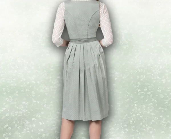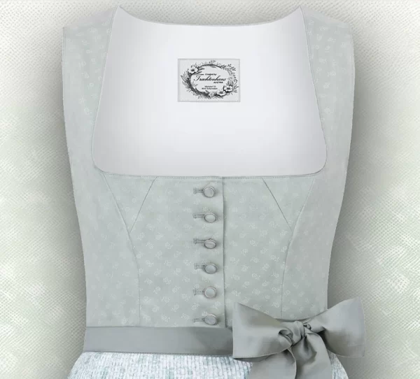 Das Dirndl von Trachtenhans in Salbei präsentiert sich in einem klassischen Stil mit einem dezenten Printmotiv und liebevollen Details. Der gerade Schnitt des Dirndls betont das Dekolleté auf eine wunderschöne Weise. Die filigranen Perlmuttknöpfe verleihen dem gesamten Look eine edle Note und setzen stilvolle Akzente.